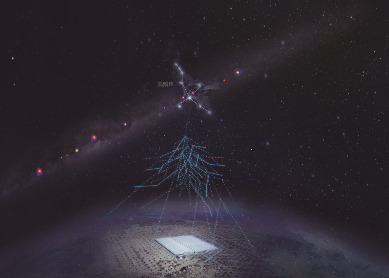 天鹅座恒星形成区是银河系在北天区最亮的区域,拥有多个大质量恒星星团,大质量恒星的寿命只有几百万年,因此星团内部充满了恒星生生死死的剧烈活动,具有复杂的强激波环境,是理想的宇宙线加速场所,被称为“粒子天体物理实验室”。高海拔宇宙线观测站在天鹅座恒星形成区首次发现拍电子伏伽马光子,使得这个本来就备受关注的区域成为寻找超高能宇宙线源的最佳天区,有望成为解开“世纪之谜”的突破口。