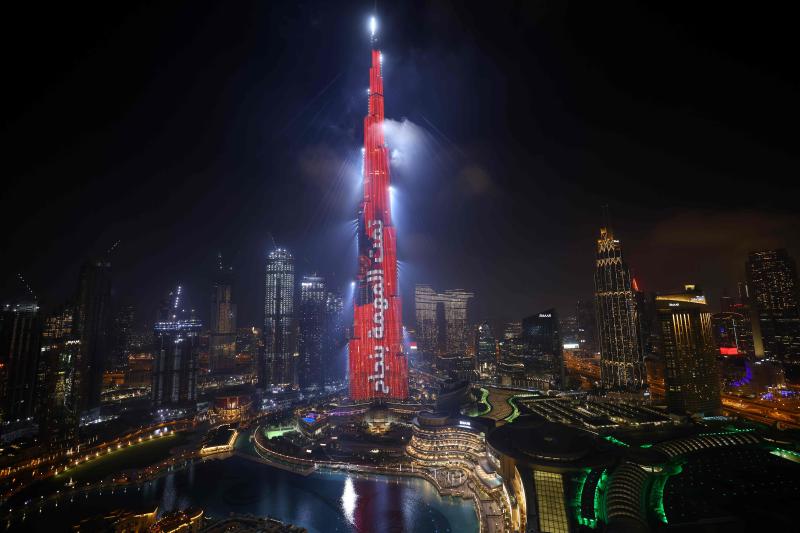 2月9日,迪拜哈利法塔显示“任务成功”字样。新华社/法新