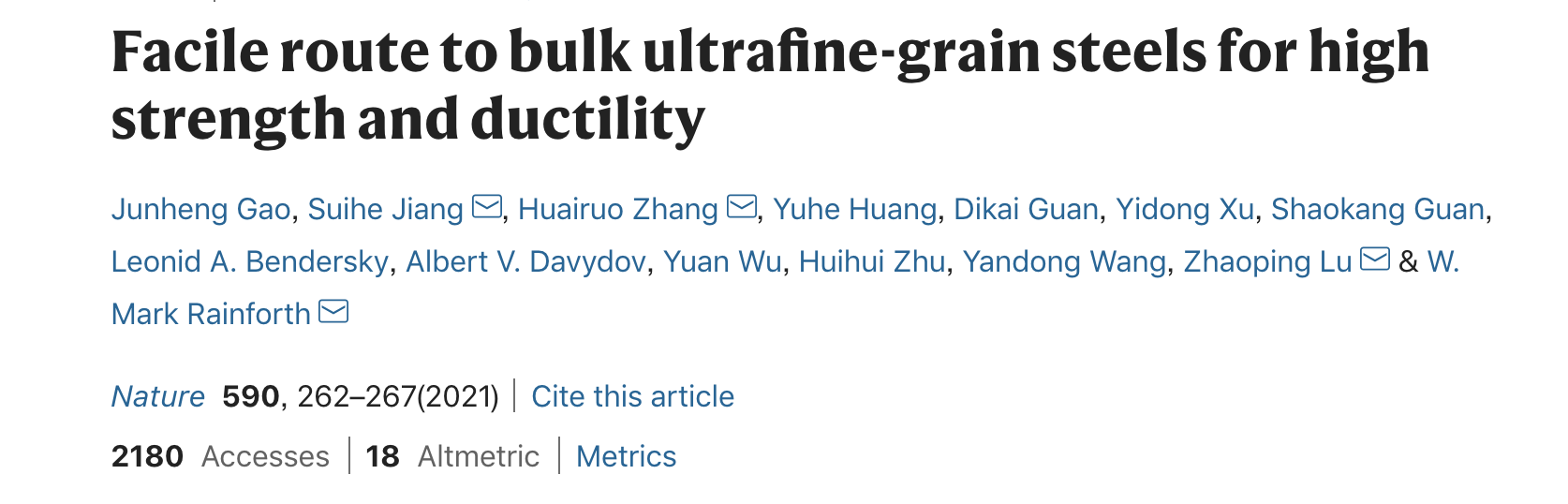 在汽车轻量化等应用驱使下,科学家们对先进高强钢的追求越来越高。日前,来自中国、英国、美国的研究团队在顶级学术期刊《自然》(Nature)在线发表了一项钢铁领域的重要突破成果,题为“Facile route to bulk ultrafine-grain steels for high strength and ductility”。