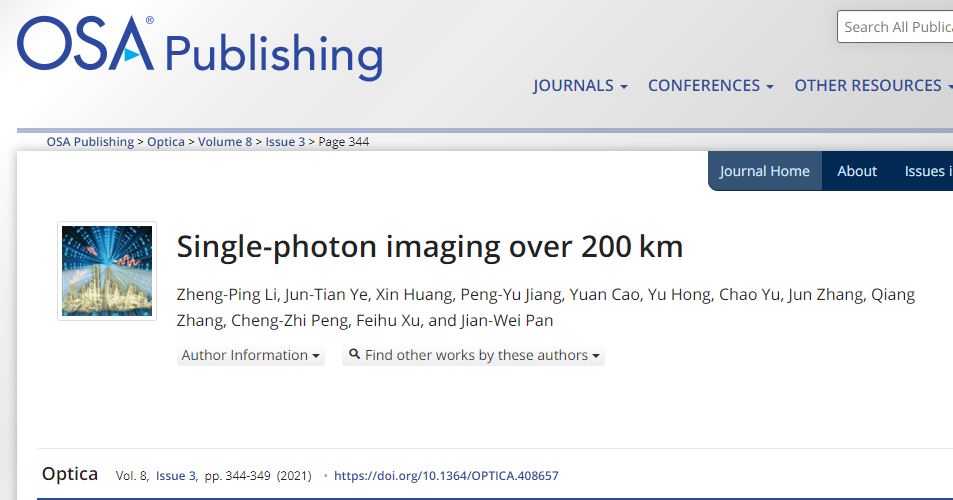潘建伟、徐飞虎团队经过长期攻关,发展了单像素单光子成像算法、近红外波段高效率单光子收集和探测、近衍射极限收发一体光学控制等核心技术。该团队于2019年在城市环境中实现45公里的单光子三维成像,突破了由英国哈利瓦特大学保持的10公里最远距离纪录。在此基础上,他们通过进一步技术突破,将成像距离拓展到201.5公里,成像灵敏度达到平均每个像素0.4个信号光子。