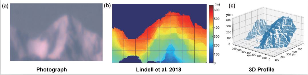 ▲201.5 km成像结果(a)可见光相机图,(b)算法重构结果图,(c)重构结果立体视图。