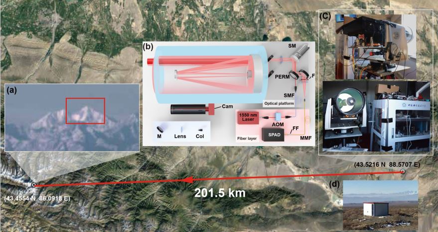 ▲单光子成像实验装置图:(a)201.5 km外目标的可见光相机图,(b)光学系统示意图,(c)实验装置实物,(d)实验场地图