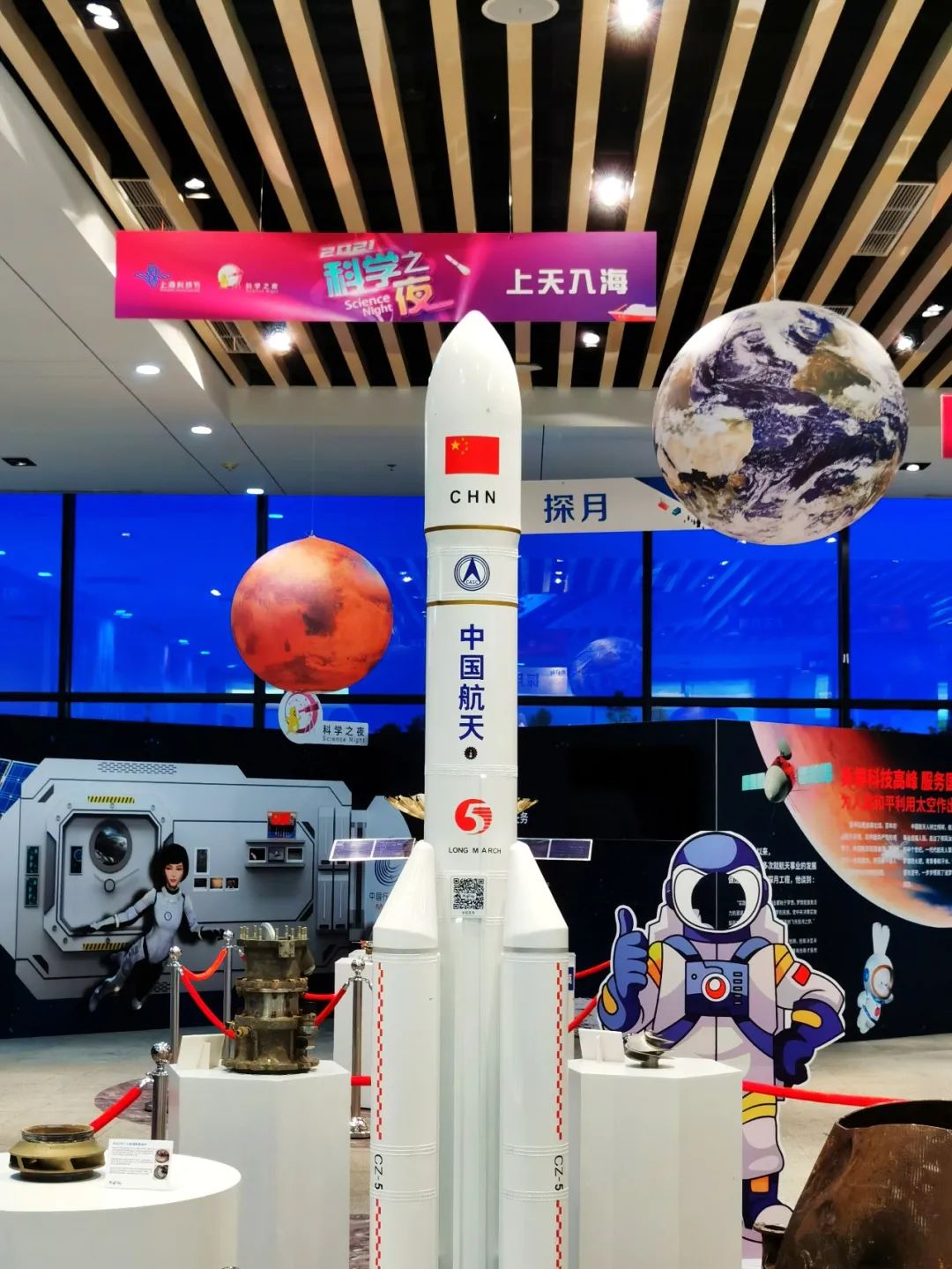 十余件航天实物展品及等比例缩小模型悉数到场,让大小观众过足了瘾。其中有长征二号丁火箭一级发动机尾喷管残骸、启动阀门残骸,还有高达2米9的长征五号运载火箭模型,“玉兔二号”月球车、“祝融号”火星车、鹊桥中继卫星、天宫二号与神舟十一号交会对接空间站等,助力中国科技强国梦,让观众对中国载人航天及深空探索有了进一步的认识。