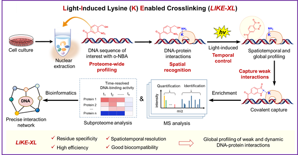 为了实现时空动态的蛋白质-DNA相互作用全景解析,中国科学院上海药物研究所陈小华课题组和谭敏佳课题组合作,在前期开发的光诱导PANAC光点击化学的基础上,发展了具有赖氨酸选择性的蛋白质-DNA交联方法【Light-Induced Lysine(K)Enabled Crosslinking,简称LIKE-XL】,并结合该团队在深度定量蛋白质组学分析方面的丰富经验和技术优势,实现了对蛋白质-DNA动态互作包括弱相互作用的转录因子-DNA的时空动态性深度解析(如图)。4月27日,相关研究成果以Spatiotemporal and global profiling of DNA–protein interactions enables discovery of low-affinity transcription factors为题,发表在《自然-化学》(Nature Chemistry)上。