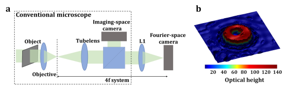 基于此,王中阳团队提出了新型的单次曝光定量相位显微技术,称为BIFT(Bandlimited Image and its Fourier Transform)显微镜。科研人员在传统光学显微镜上引入分束器和傅里叶透镜,同时采集显微物体的像以及透镜变换后的傅里叶像。BIFT显微装置如图a所示。研究通过利用显微系统中固有的视场、频谱受限以及有限照明等作为约束条件,从而避免了成像物体的先验约束,去除了CDI技术中常见的三类模糊解(即无法区分原始物体的平移、共轭旋转以及全局相移),提升了解的唯一性和算法的收敛性。同时,该技术的空间带宽积(SBP,衡量显微系统成像信息容量的不变量)仅受显微物镜参数限制,打破了CDI技术成像系统SBP依赖于采样率,会因其过采样需求而SBP降低至少一半的限制。由于采集了像的幅度信息,该技术的采样率相比CDI技术降低了一半,同时改进的算法提升了算法收敛速度和相位重构精度。此外,该工作还讨论了采样率、像素响应、噪声等因素对相位恢复的影响。实验演示了光栅和血红细胞的单次曝光相位成像。在血红细胞的定量相位恢复的实验研究中显示,该技术单次曝光的条件下即达到了数字全息显微中10帧图像才能达到的效果。重构的红细胞光学高度如图b所示。因此,该技术单次曝光相位成像的能力有望在无标记生物动态成像中得到广泛应用。