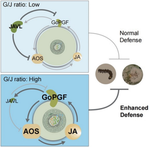 研究显示,GoPGF和JAVL的比例(G/J)是决定棉花色素腺体大小和植保素类化合物含量的关键因素。在正常情况下,G/J在mRNA和蛋白质水平上通常保持在较低水平,而JAVL抑制GoPGF和AOS的转录,从而维持茉莉素的较低水平、色素腺体的正常大小以及防御化合物的基础水平。在G/J显著增加的植株中,JAVL的抑制作用降低,导致GoPGF和AOS的表达量上调,从而促进茉莉素积累、色素腺体增大和防御化合物增加,使植物表现出更强的抗病虫能力。