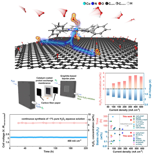 近日,中国科学院上海高等研究院绿色氢能与高效储能研究团队在工业级电流密度下PEM电解合成H2O2方面取得进展。相关研究成果以Oxygen Functional Groups Regulate Cobalt-Porphyrin Molecular Electrocatalyst for Acidic H2O2 Electrosynthesis at Industrial-Level Current为题,发表在《德国应用化学》上。