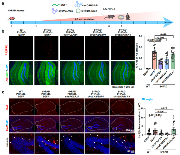 AAV递送的ds-cRNA在5xFAD小鼠海马组织中减少Aβ斑沉积,抑制胶质细胞增殖。