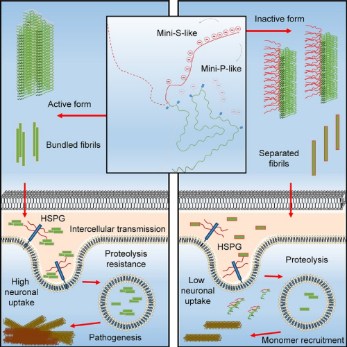 研究利用冷冻电镜、固体核磁共振和氢/氘交换质谱等技术,解析了这两种纤维在柔性区的差异。结果表明,紧凑的Mini‑P型纤维由于屏蔽了部分负电荷,可以更有效地与神经元表面的受体——硫酸乙酰肝素蛋白聚糖结合,从而更易被神经元摄取。同时,这种结构使突触核蛋白病理纤维对蛋白酶的降解具有更高的抵抗力,延长了细胞内的半衰期。相反地,Mini‑S型纤维在体外能够更快地募集单体形成纤维,但其较松散的柔性衣壳导致神经元致病活性较低。