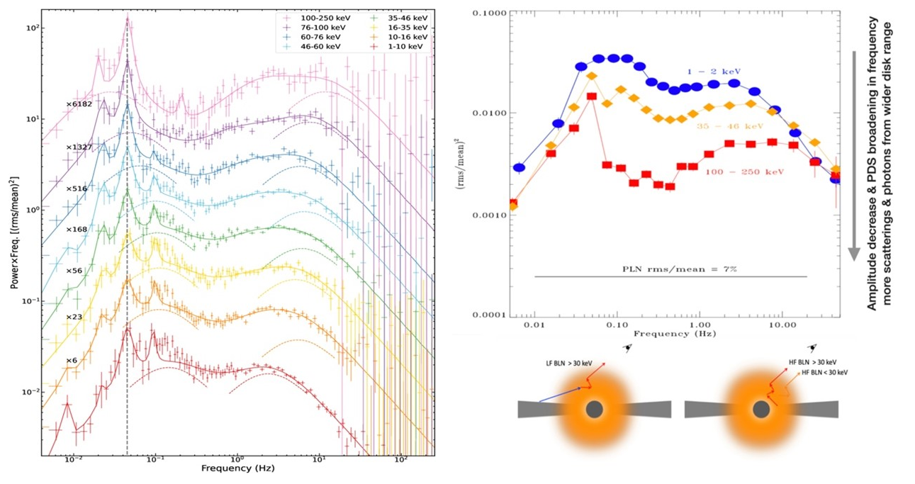 左图:黑洞双星MAXI J1820+070的慧眼卫星单次观测随光子能量变化的傅里叶功率谱。右图:带限噪声平台与光子能量和吸积与逆康普顿散射的物理图像。