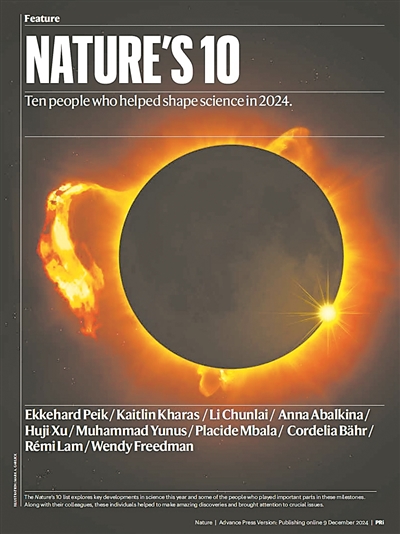 《自然》杂志10日发布了2024年十大(Nature's 10)科学人物。年度十大科学人物是《自然》从当年一些宏大科学故事的参与者中评选出的10个人。《自然》特写部编辑布兰登·马赫表示:“今年的十大科学人物对科学界和全世界产生了不容忽视的影响。”